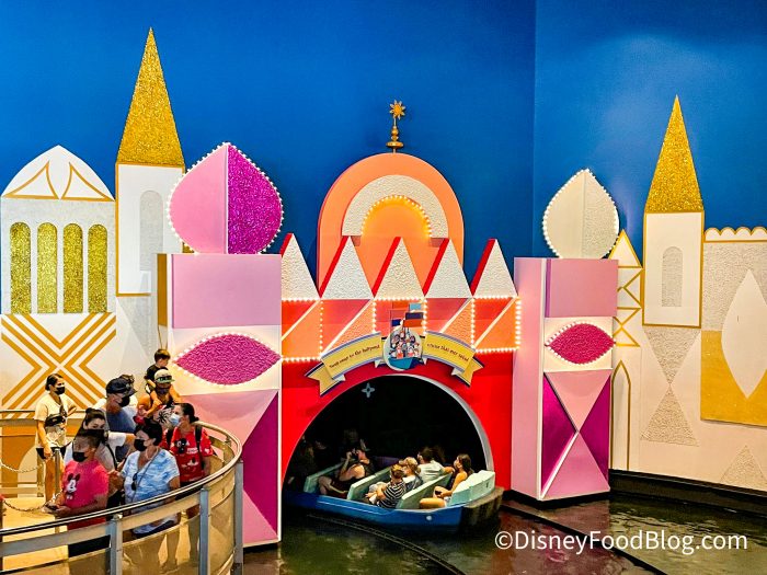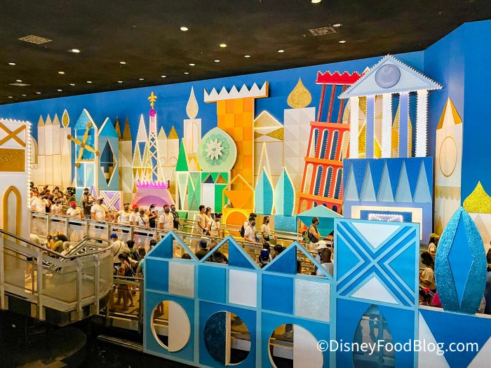 Over in Fantasyland, the queue at “it’s a small world” has been getting a colorful makeover ever since it closed for a short period of time for refurbishment in July. Now, the colors have expanded beyond the clock tower decorations, and splashes of green, pink, yellow, blue, and gold have been added to more of the decorations…
