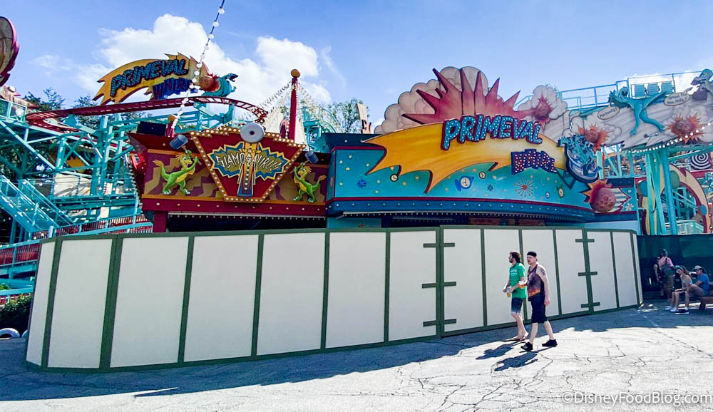 At Disney’s Animal Kingdom, we also noticed some construction action happening over at a closed attraction in DinoLand U.S.A. — Primeval Whirl. The ride closed for good back in 2020 and Disney even removed the ride vehicles, but otherwise, the attraction has sat mostly untouched until now.