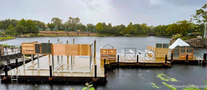 And, with the passing of another week, Disney has made more progress on the new daytime show coming to Disney’s Animal Kingdom for the 50th Anniversary. Disney KiteTails is set to debut on October 1st and we’ve been watching as brand new floating platforms transform into showpieces on the water next to the Discovery River Amphitheater. Just last week, we noticed new structures on the dock…