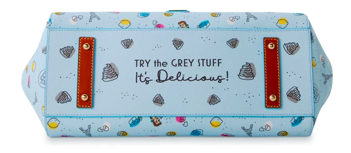 The satchel has leather trim and a removable, adjustable shoulder strap. It’s also got slip pockets inside, plus an exterior zip pocket. Like the tote, you’ll find the quote “Try the grey stuff. It’s delicious!” on the bottom.
