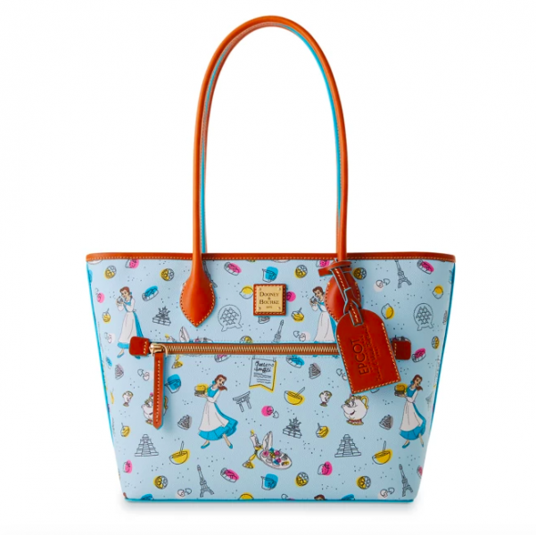 You can get five new Dooney and Bourke x Disney bags on shopDisney now! We spotted two new bags from the Beauty and the Beast-themed EPCOT International Food and Wine collection from this year. The tote in this collection is $268. It has a pattern of Belle, Lumiere, Mrs. Potts, and other Beauty and the Beast characters, mixed in with EPCOT pavilion landmarks and images of food.