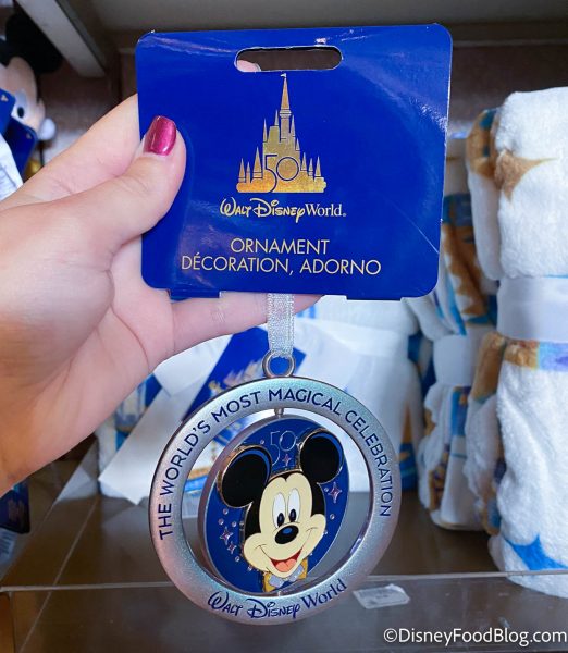 There are several new 50th anniversary ornaments, including this one for $26.99 with Cinderella Castle on top of a clear 50th ornament.