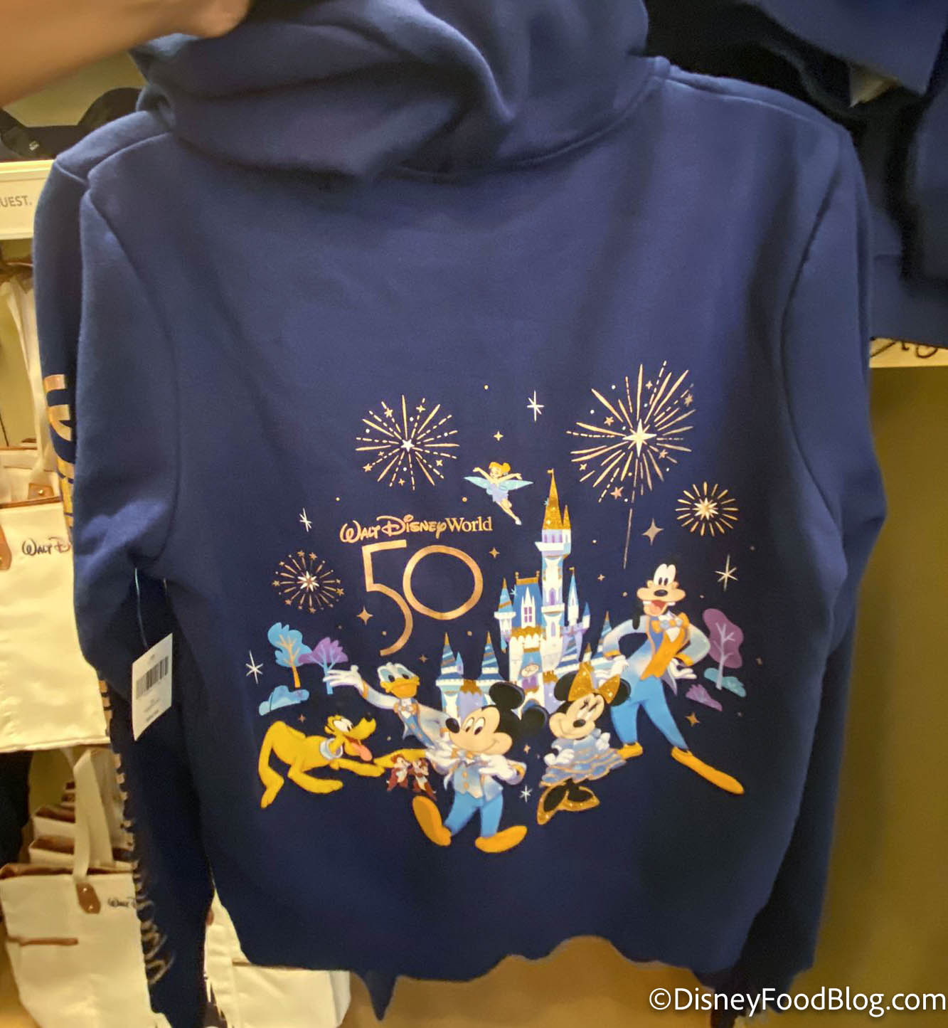 And this fun 50th Anniversary Hoodie comes in a mustard color with the 50th logo on the front and a Mickey silhouette on the back.