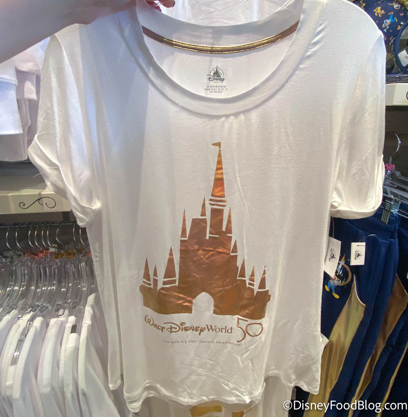 And this white 50th Anniversary T-Shirt is $36.99, with a gold Cinderella Castle and 50th logo.