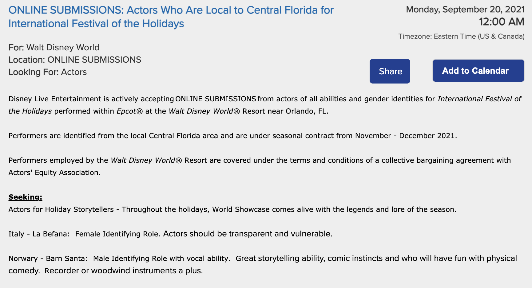 Disney Jobs shared a post this morning detailing a request for actors local to Central Florida. They’re looking for someone to fulfill the role of La Befana (the Italy storyteller) and Barn Santa (the Norway storyteller) during the festival. Those interested in these roles will need to apply before the end of September. Callbacks are scheduled for next month.