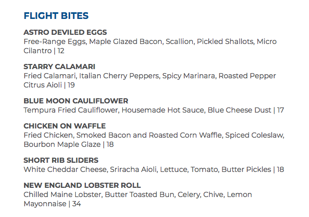 Some of the lounge exclusives include the Astro Deviled Eggs, the Chicken on Waffles, and the New England Lobster Roll. The lounge menu also features some of the starters like the Blue Moon Cauliflower and the Starry Calamari. We’ve got a FULL REVIEW of the lounge eats coming soon!