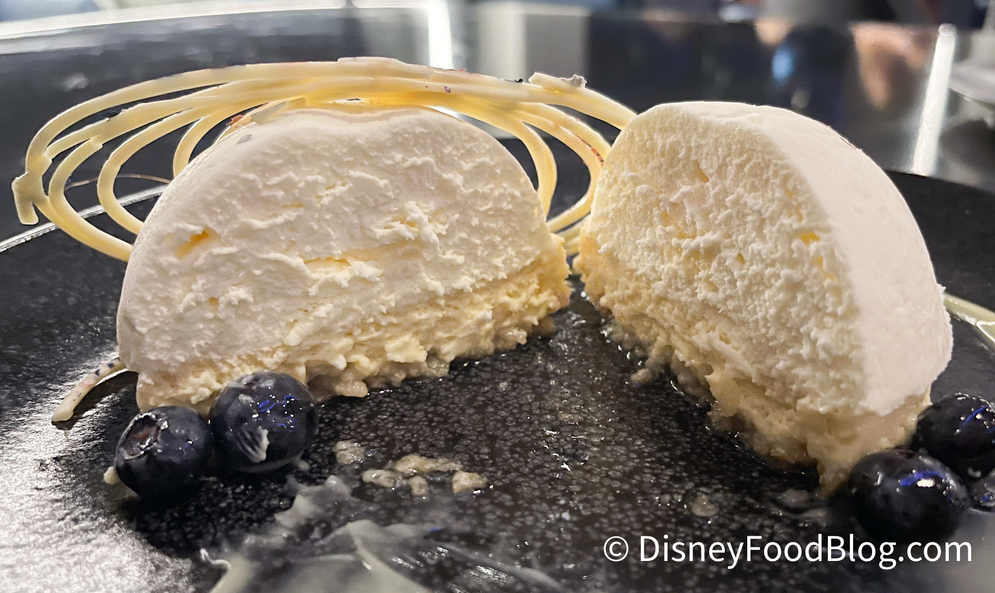 The Lemon Mousse comes in a Sphere shape and is adorned with White Chocolate Rings, Lemon Custard, Marinated Blueberries, and Lemon Curd. First off, let’s take a moment and appreciate how BEAUTIFUL the presentation is with this dessert!