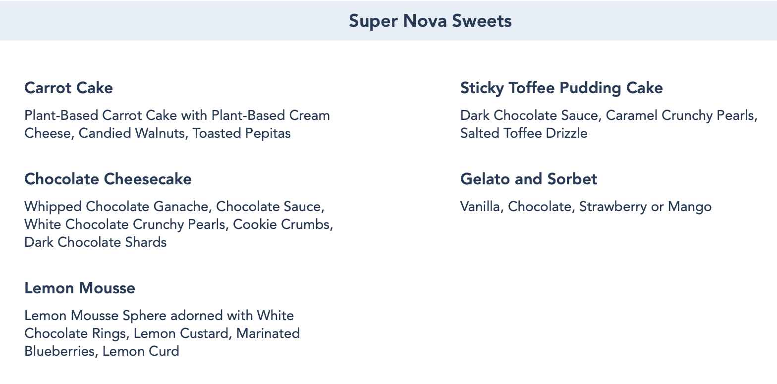 As for the Super Nova Sweets, you can choose between Carrot Cake, Sticky Toffee Pudding Cake, Chocolate Cheesecake, Gelato and Sorbet, and Lemon Mousse.