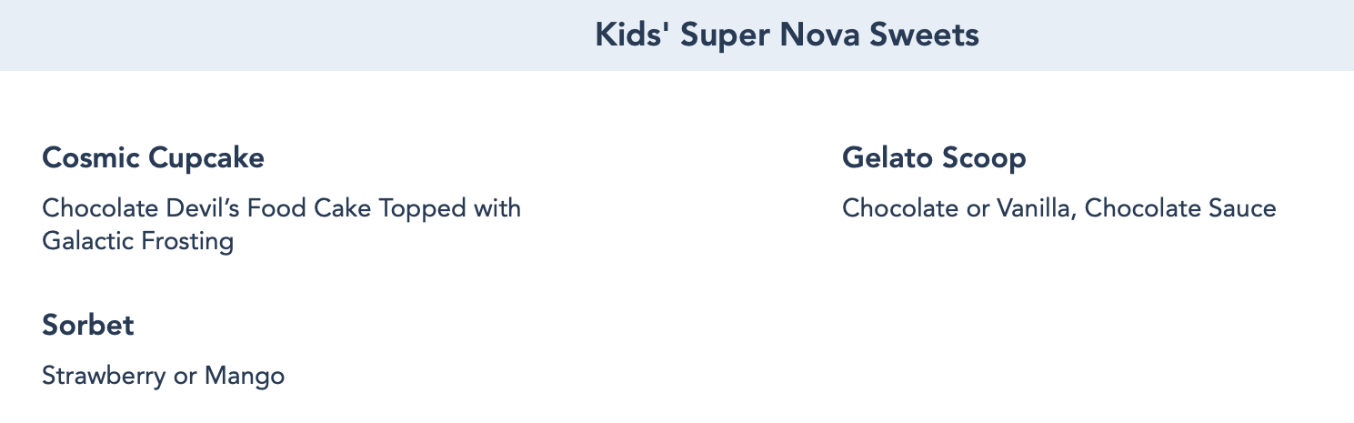 And for dessert, kids can choose from a Cosmic Cupcake, Gelato Scoop, or Sorbet.
