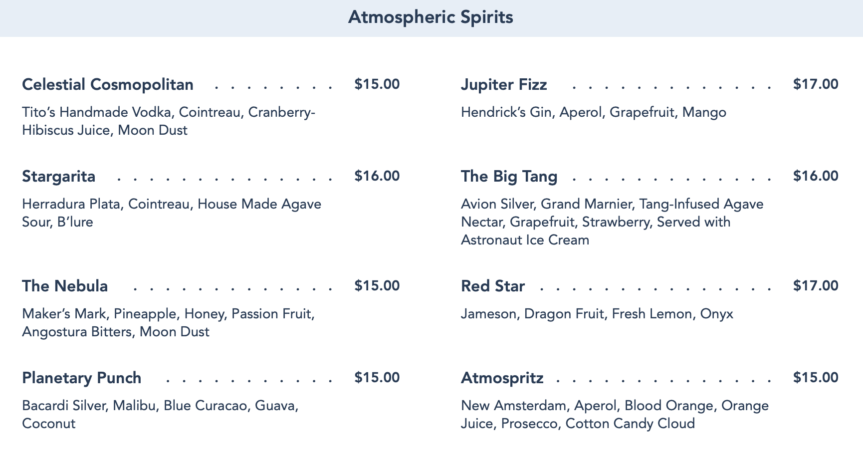 The MISSING drink we finally got to try (and TBH one we were excited to taste) was missing a key component on opening day — astronaut ice cream. They didn’t have the freeze-dried ice cream sandwich garnish for most of opening day, so we skipped it (because the drink with astronaut ice cream but they’re OUT of astronaut ice cream is just sad!). So finally, introducing The Big Tang. For $16, this drink is made with Avion Silver, Grand Marnier, Tang-Infused Agave Nectar, Grapefruit, Strawberry, and is served with Astronaut Ice Cream.