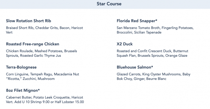 The Star Course options are the Slow Rotation Short Rib, Florida Red Snapper, Roasted Free-range Chicken (also on the lunch menu), X2 Duck, Terra-Bolognese (also on the lunch menu), Bluehouse Salmon (also on the lunch menu), and 8oz Filet Mignon.