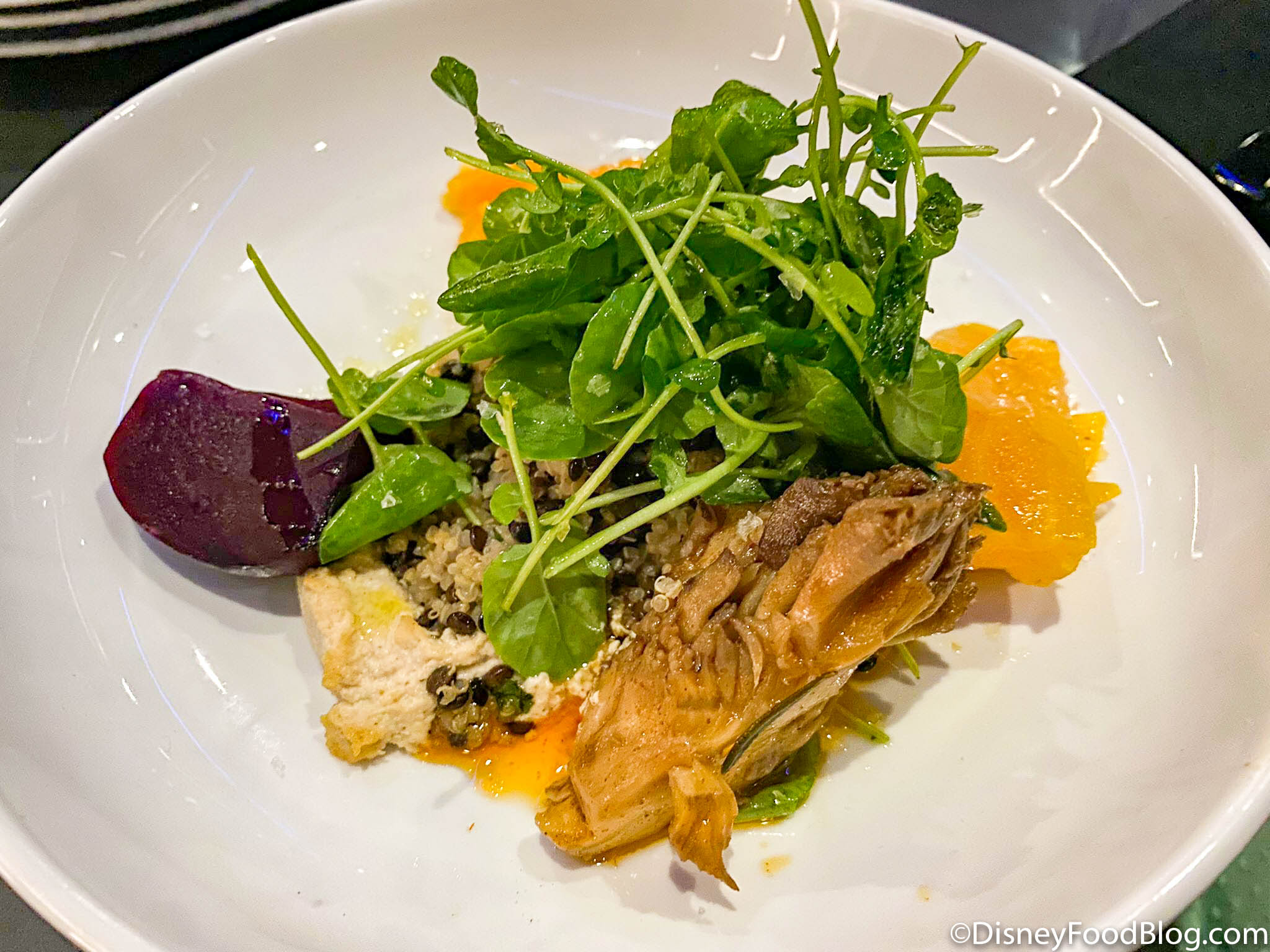 Of all the appetizers we tried, we found the Galaxy Grain Salad to be our least favorite — but it wasn’t because it was the plant-based dish! This dish comes with Quinoa, Beluga Lentils, Roasted Red and Golden Beets, Oranges, King Oyster Mushroom, and Cashew Hummus.