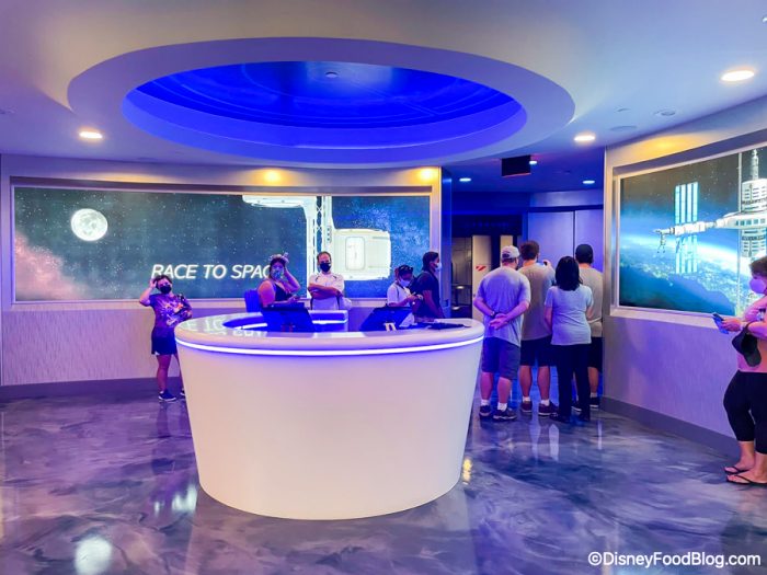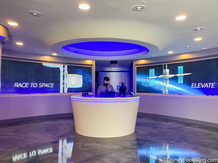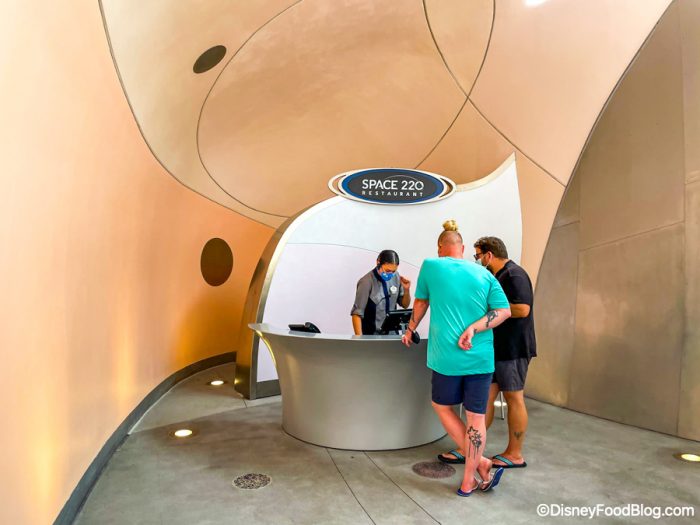 As you near the restaurant’s entrance, you’ll find a Space 220 desk with a Cast Member assisting guests.