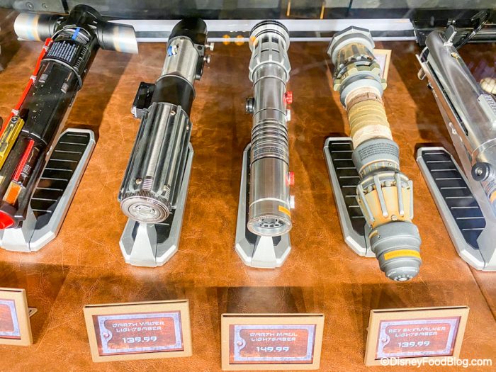 You can build your own droid, buy a shoulder porg, or even special soda bottles (when they’re available)! But, of course, the most popular souvenirs are the lightsabers, of course. You can make your own lightsaber during the experience at Savi’s Workshop, but if you don’t want to do that, you can also buy lightsabers over at Dok-Ondar’s Den of Antiquities! And now, 3 very popular lightsabers have made their return to the shop!