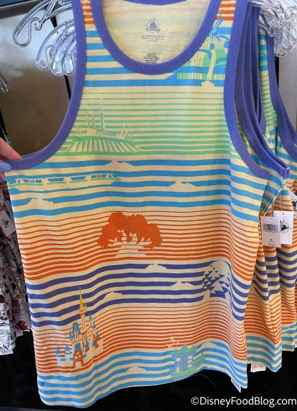 This Disney Parks Icons Tank Top has lots of colorful stripes with images of Disney icons like the Tree of Life, Space Mountain, and Cinderella Castle.