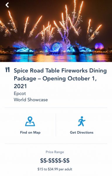The Spice Road Table fireworks dining package is priced at $72 per person (ages 10 and older) and $31 per child (ages 3 to 9). These prices are inclusive of tax and gratuity.