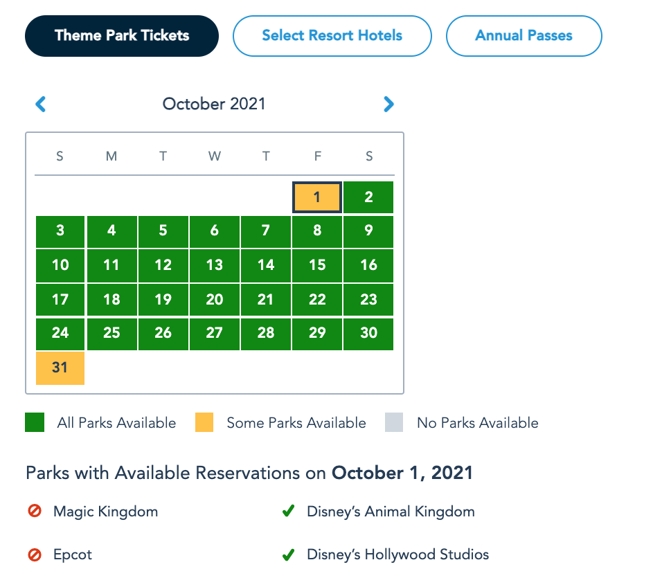Park Pass Reservation availability for guests with Theme Park Tickets for October 1st as of September 23rd © Disney