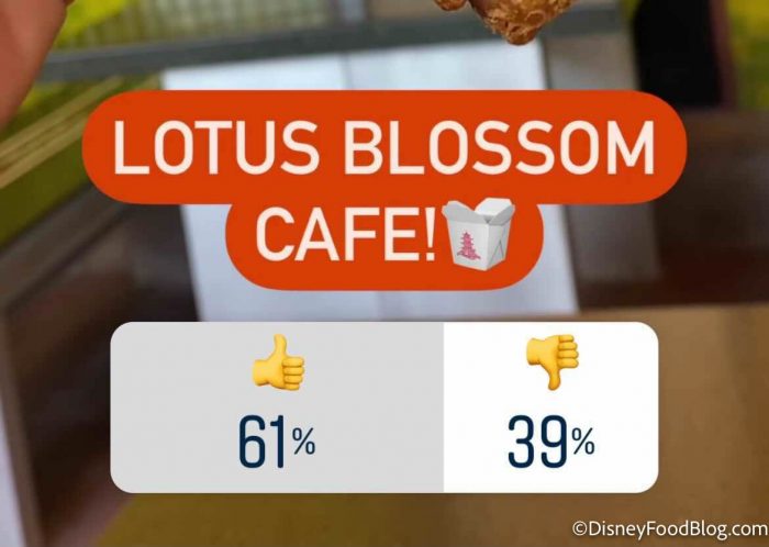 Lotus Blossom Cafe received 61% thumbs up and it is generally a fairly popular place. However, while a lot of the menu items are tasty, a lot of Lotus Blossom Cafe’s eats can be found at your favorite local Chinese takeout spot, so keep that in mind at your next EPCOT visit.