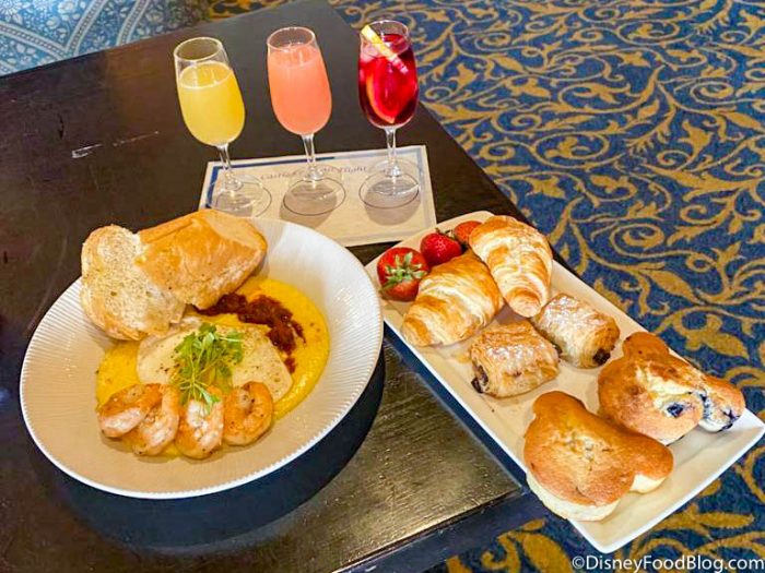 Breakfast at Cinderella’s Royal Table is priced at $42 per adult and $27 per child. This is the cheapest meal at the 3 restaurants we’re looking at in this article. Breakfast includes assorted pastries and an entree. Kids get an entree and create-your-own selections. Standard breakfast drinks are also included. So that’s sort of 2 courses for $42 or $27.