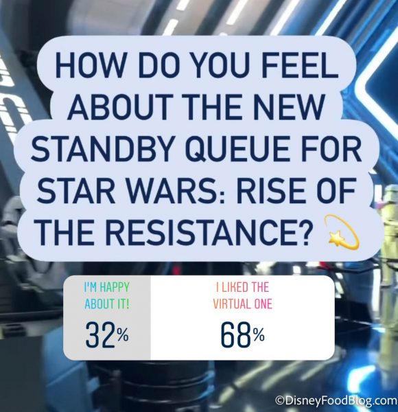 We asked for votes on Instagram about the new standby queue for Rise of the Resistance, and feelings were strong with over 9,000 DFB readers. 68% of you prefer the virtual queue system, and 32% are happy about the new standby line. It’s important to note that many people were unable to secure Boarding Groups during their visits, so some people might prefer the standby line.