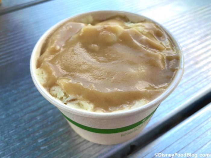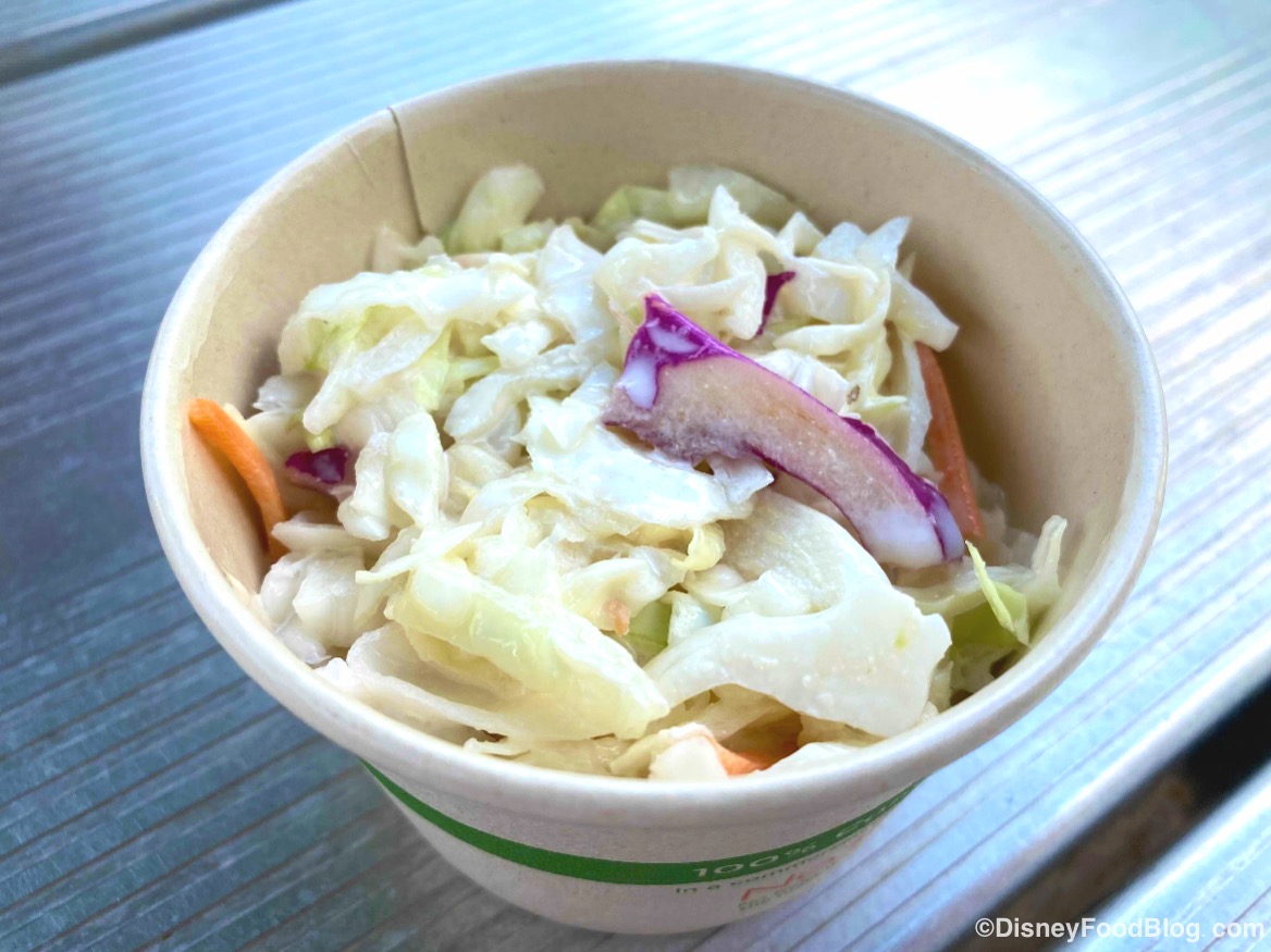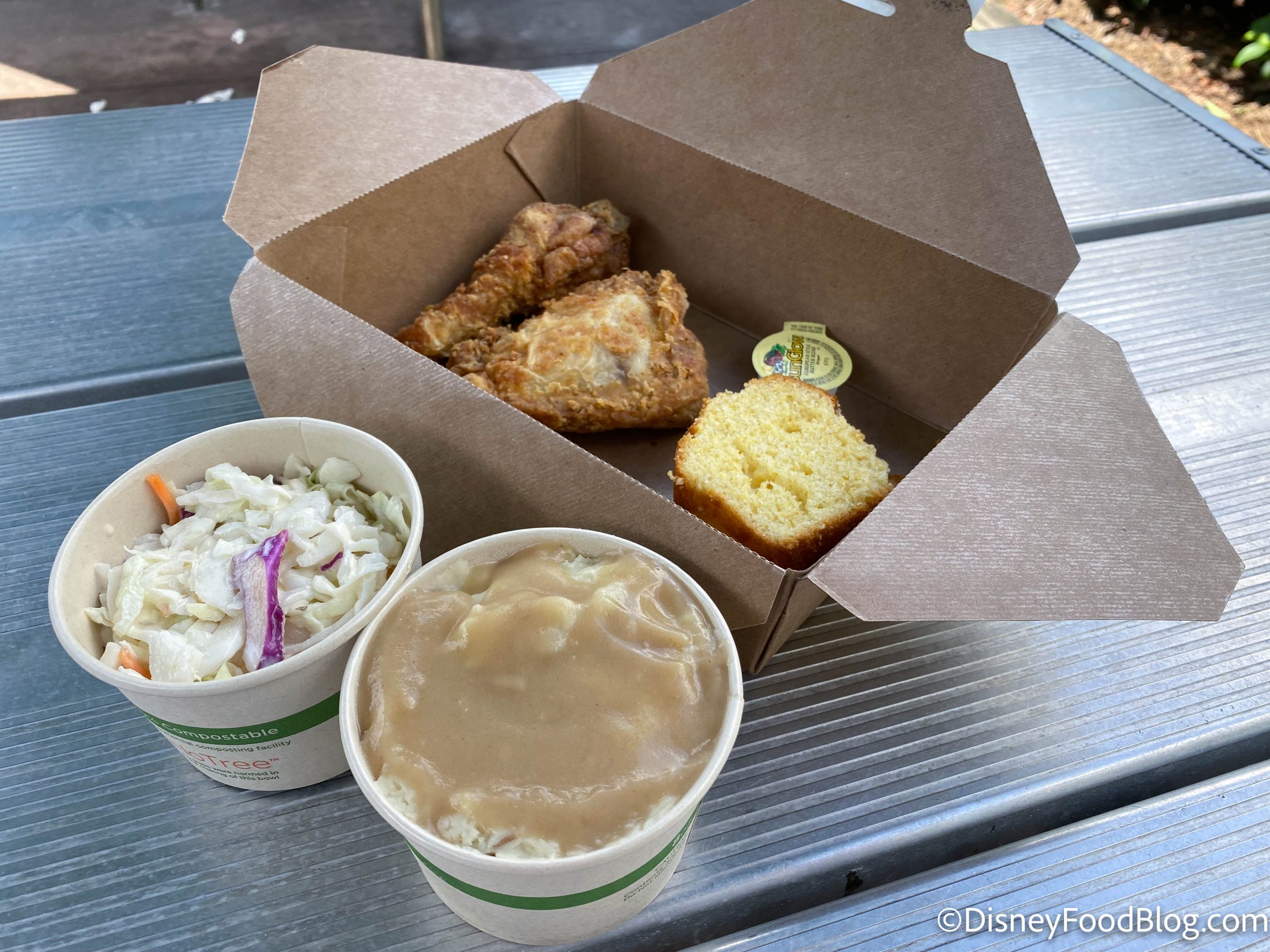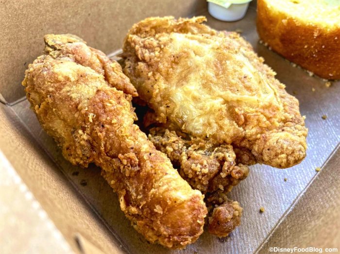 The fried chicken is the same classic recipe you’ll get at Hoop-Dee-Doo Revue and that used to be served at Trail’s End, both also on-site at Fort Wilderness. We were glad to see that we received dark meat, a drumstick and a thigh, which means more flavor! Juicy and tender and coated in the crispy, seasoned breading, this fried chicken is some of the best in the wilderness. We ate ours soon after receiving it but we suspect if you left it in the box too long transporting it, your chicken might get a little soggy. Just something to keep in mind if you want maximum chicken crunch (and really, who doesn’t?).