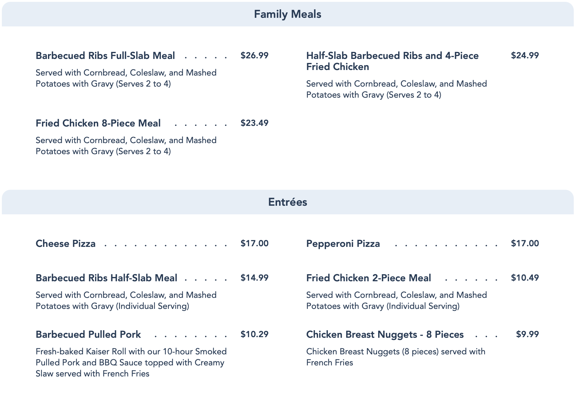 P&J’s Takeout is a great place if you’re on the go and want to enjoy the flavors of Trail’s End or the still closed Hoop-Dee-Doo Musical Revue! With barbecue classics and American favorites, this menu can please most palates. The prices are surprisingly good for some of the entrees. If you’re finding a full adult entree meal (with multiple sides!) for about 10 bucks in Disney World, you’ve struck gold. Seriously, a family dinner meal for 2-4 people for 25 bucks is HUGE in Disney World. Plus the food is quite tasty and well prepared to boot. We enjoyed our meal at P&J’s, but it wasn’t anything particularly special. The dishes are familiar, the location is convenient if you’re nearby, the prices are downright reasonable (even for Disney!) for the quantity of food you receive, and the Mobile Order service is quick.