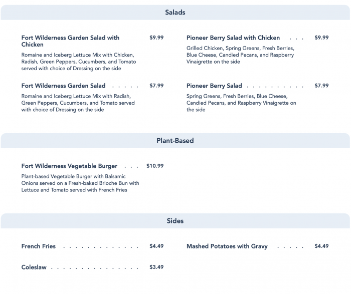…Salads like the Pioneer Berry Salad, a Plant-Based option, Sides…