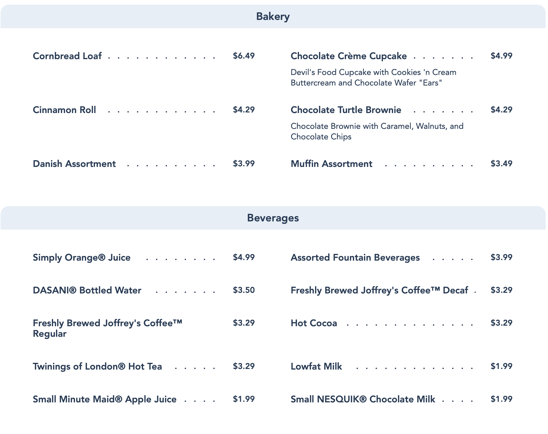 …Bakery options like the Chocolate Turtle Brownie, and, for anyone who’s a fan of the cornbread at the Hoop-Dee-Doo Revue, yep, you can get your own loaf of it here! Beverages…
