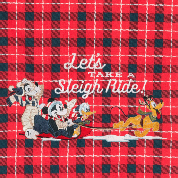 One side features a bright red plaid pattern with an embroidered Mickey, Donald, Goofy, and Pluto on a sleigh ride…
