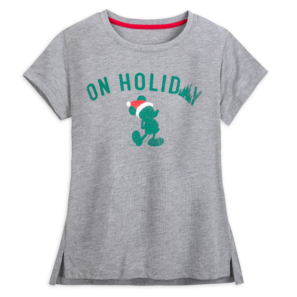If you’re looking for a short-sleeved shirt, you can pick up the “On Holiday” tee! This shirt features Mickey Mouse in a Santa hat, and the words “On Holiday” on top. Except, the “a” in Holiday is formed by a Castle!