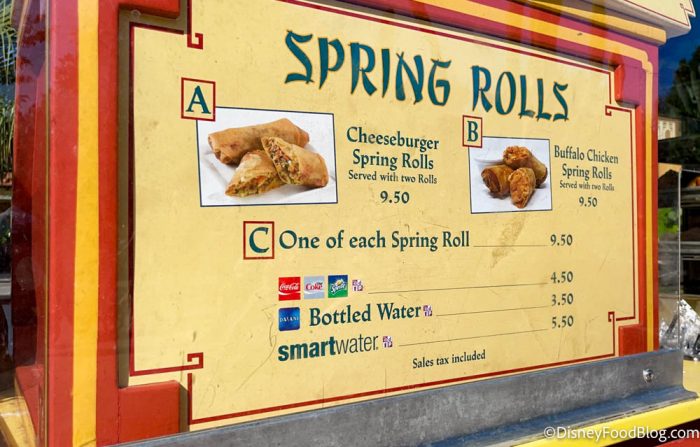 When we stopped by at 10AM this morning, the cart hadn’t opened yet, but there were Cast Members working behind the counter, and the display case was stocked with Spring Rolls ready to go.