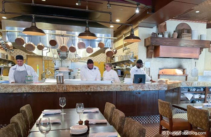 The combination of textures and finishes results in modern meets old-world charm that keeps the restaurant feeling substantial, yet casual enough to enjoy a family meal in your Disney gear! Great welcoming vibes aside, we have to mention the real gem of this restaurant –Its massive OPEN kitchen! This dynamic element immerses diners in the sights, sounds, and smells of a bustling Italian kitchen.