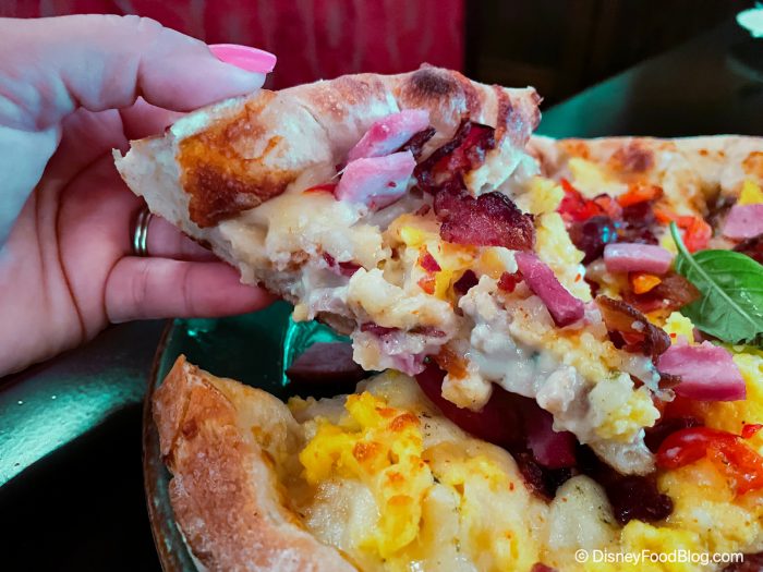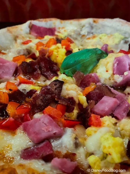First, let’s talk crust — remember that incredible pizza oven?! The house-made dough is puffy, slightly sweet, and baked in the restaurant’s stone pizza oven resulting in a perfectly cooked — crispy-chewy combo! We know it sure kinda LOOKS like Disney World puffy pizza crust you might find at a slew of fast food pizza spots in Disney World, it’s not. Fans of a thinner crust might be a bit disappointed, but if you like a little chew to your pizza, you’ll likely enjoy this.