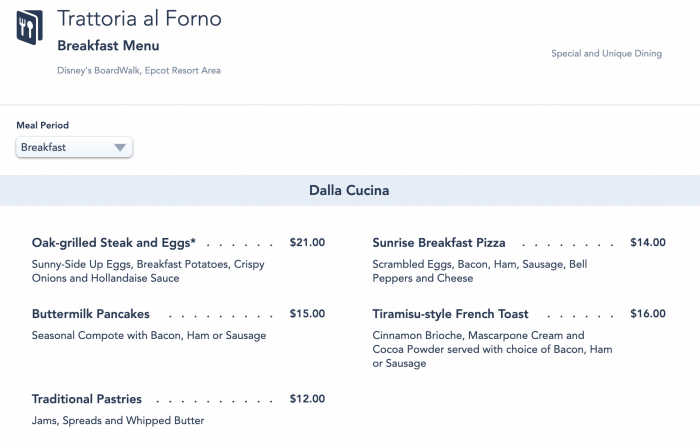 Recently, Trattoria al Forno released two new menus, bringing some exciting (and pretty delicious) Italian flavors to Disney’s BoardWalk. Their new dinner menu impressed –So much so, we reserved ourselves a spot for breakfast!