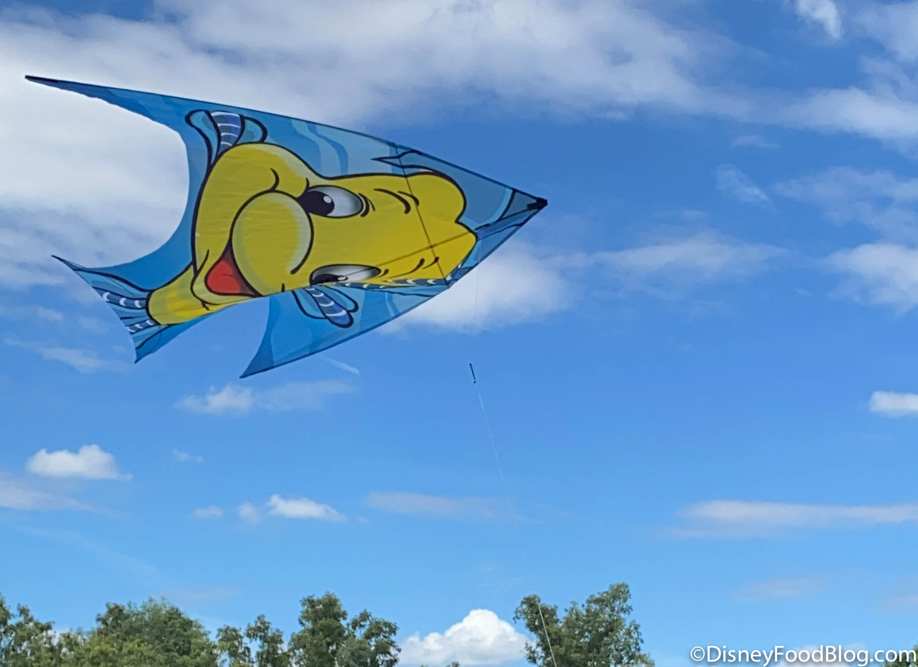 We spotted kites featuring all kinds of Disney characters set to Disney tunes! On land, we saw a kite being held by one Cast Member featuring Sebastian and another featuring Flounder. Both kites were maneuvered around by the Cast Members as instrumental versions of songs from The Little Mermaid including Under the Sea and Kiss the Girl played in the background!