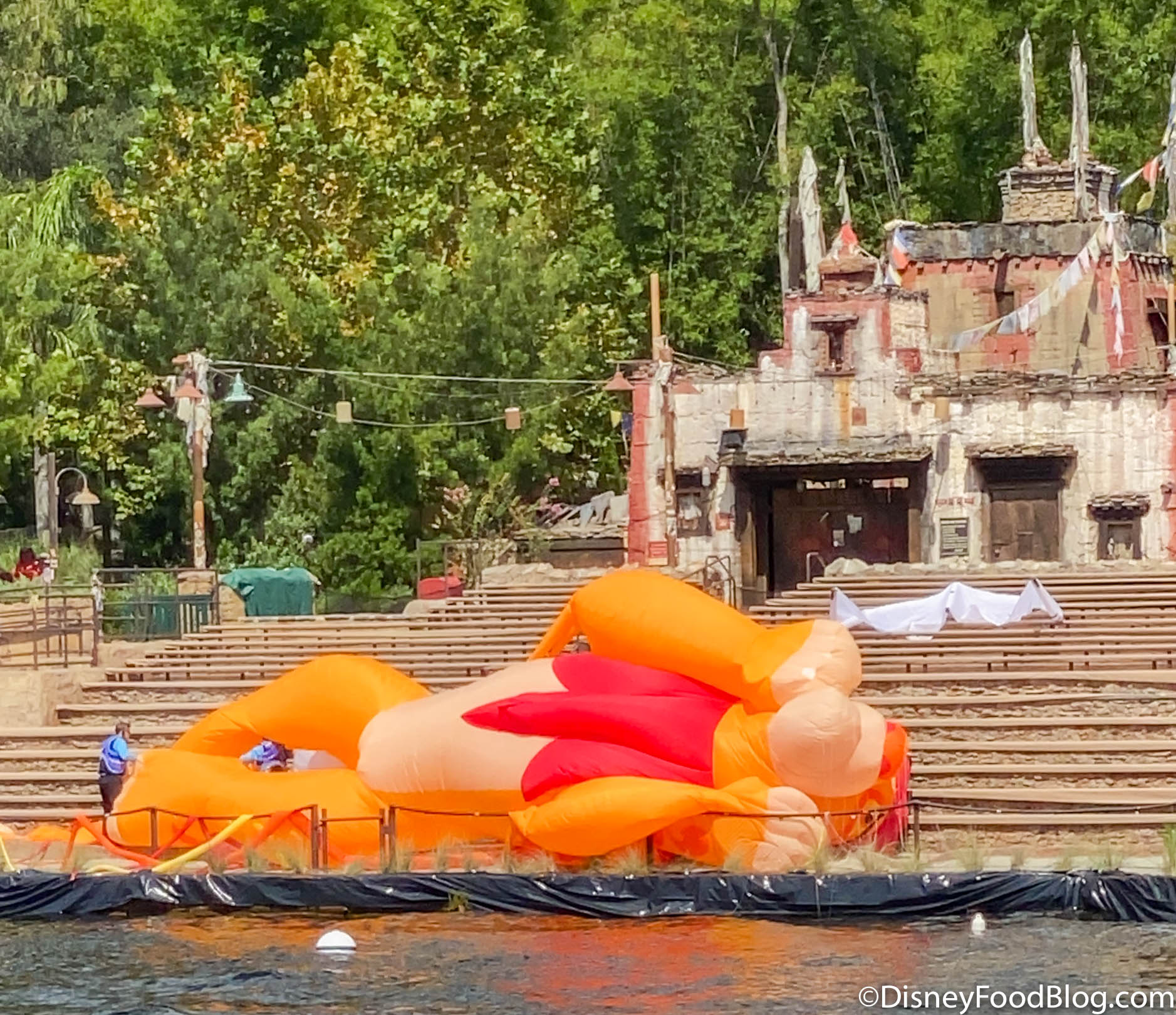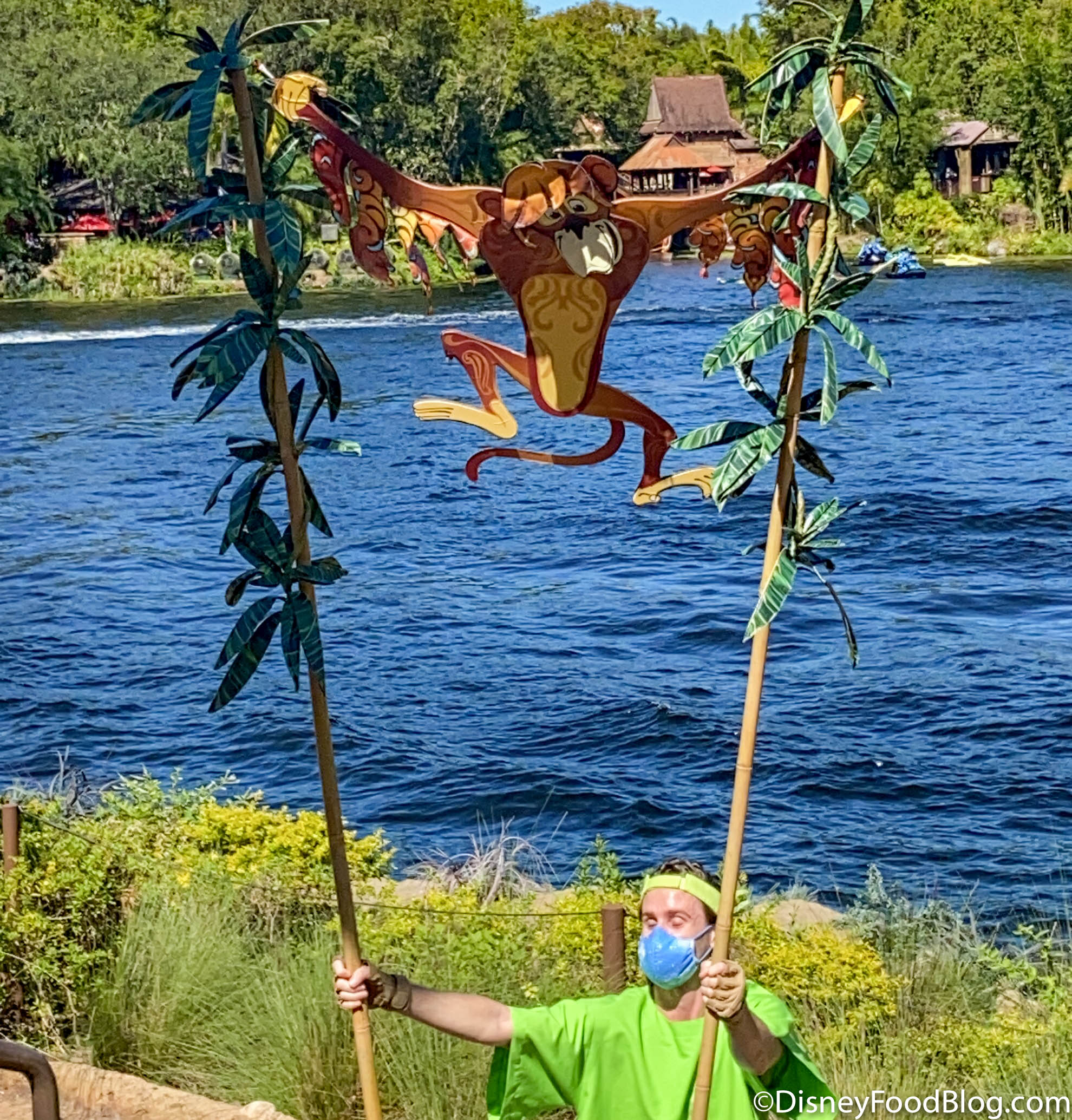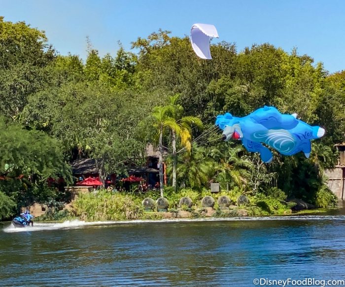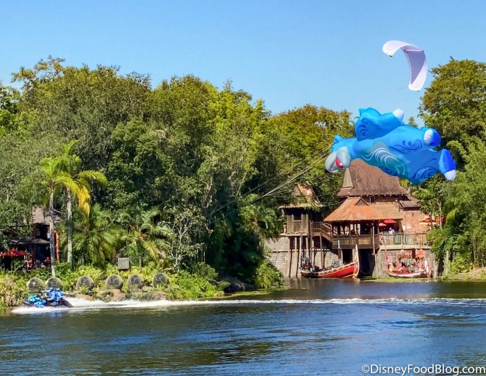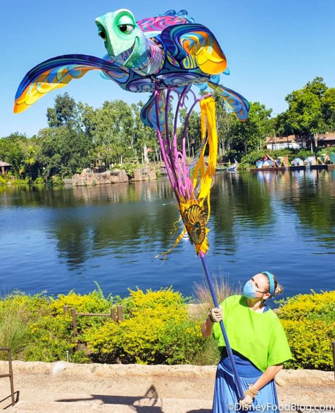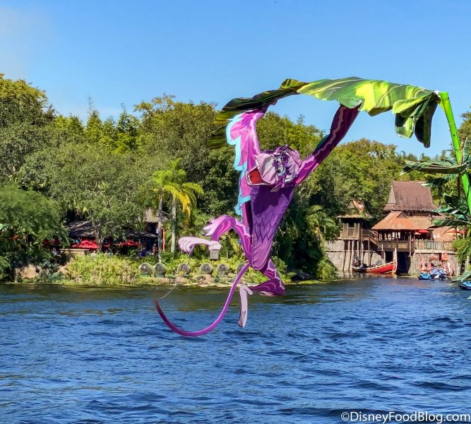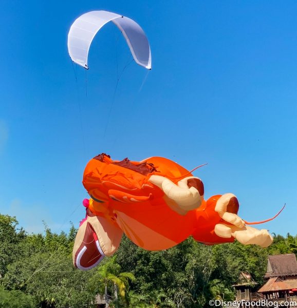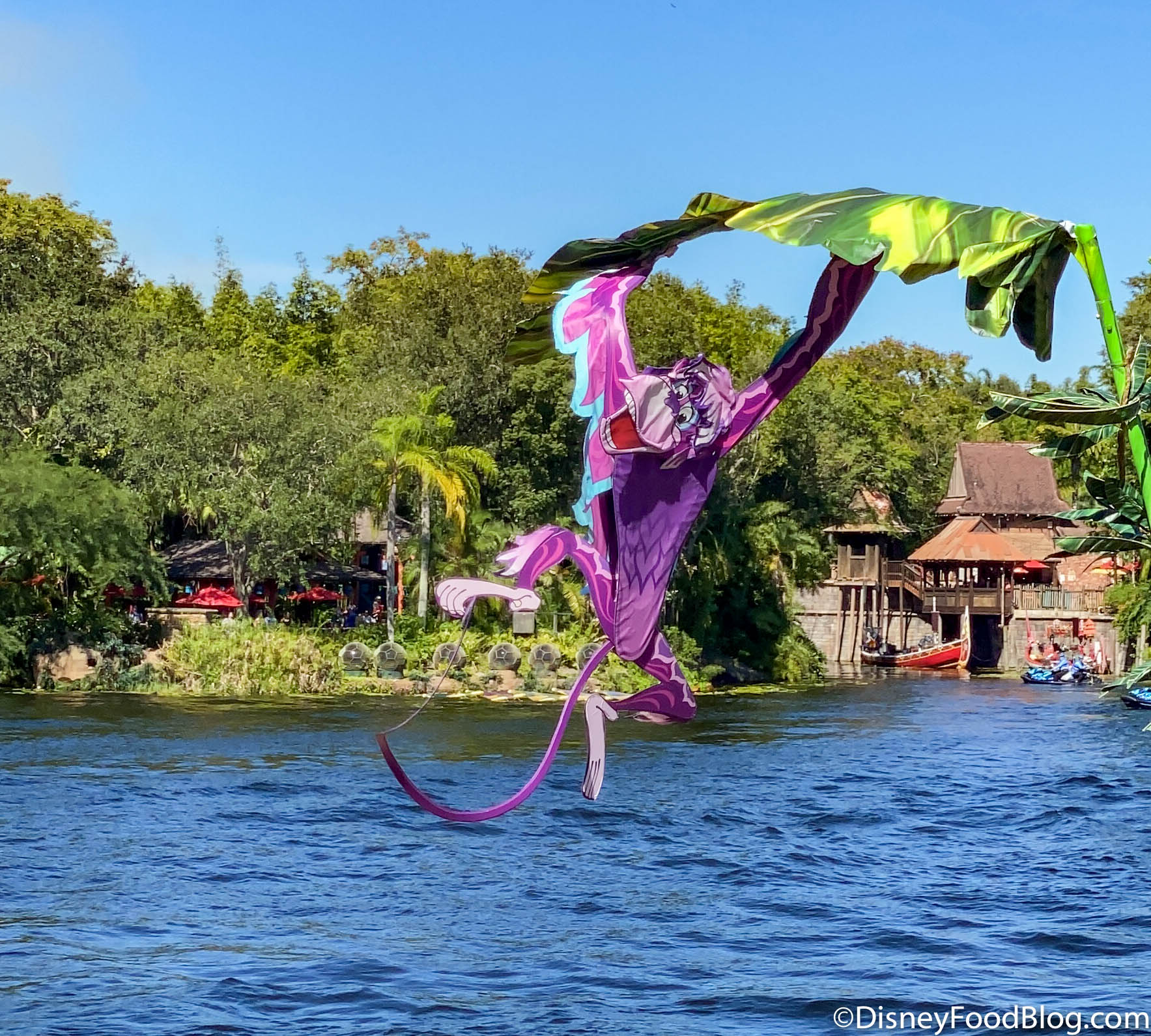 As the monkey kites were being operated by Cast Members on the ground, and the kites with long tails flew over the water, King Louie also made his rounds and I Wan’na Be Like You played in the background for everyone to dance along to!