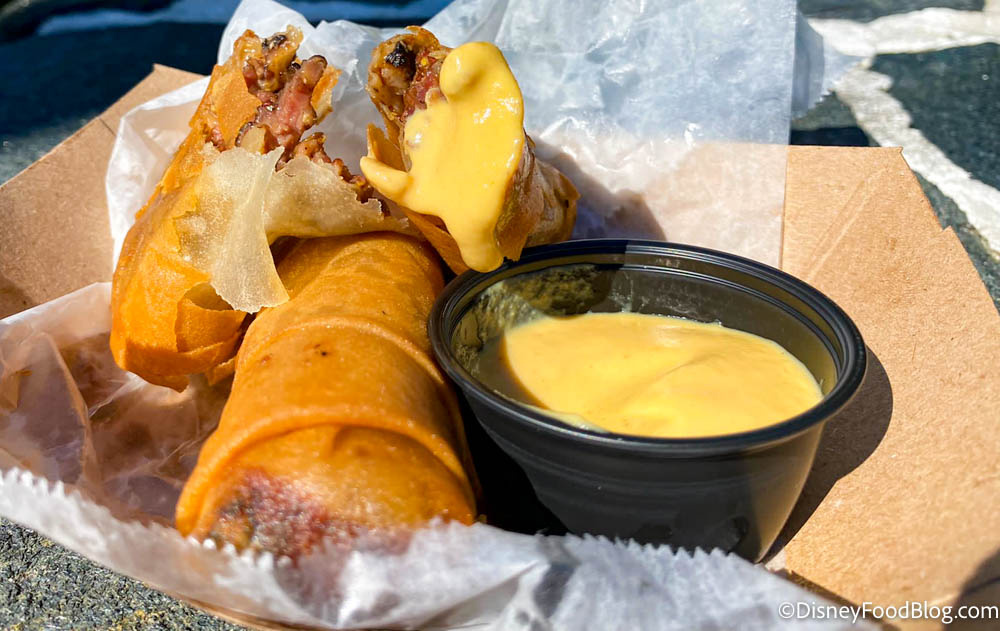 You can get the new 50th Celebration Spring Rolls at the Spring Roll Cart (near the Adventureland entrance in Magic Kingdom) for $9.50 for two rolls. Or you can try the Cheeseburger Spring Rolls (a classic) or mix it up and get one of each! Keep following DFB for more updates and reviews of all the new 50th Anniversary snacks.