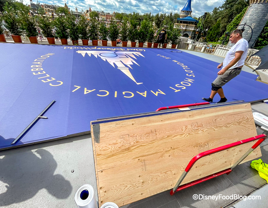 The Cinderella Castle stage is being updated with 50th Magical Celebration flooring. It’s still a work in progress, but for now, we can see the EARidescent 50th castle logo on a blue background.