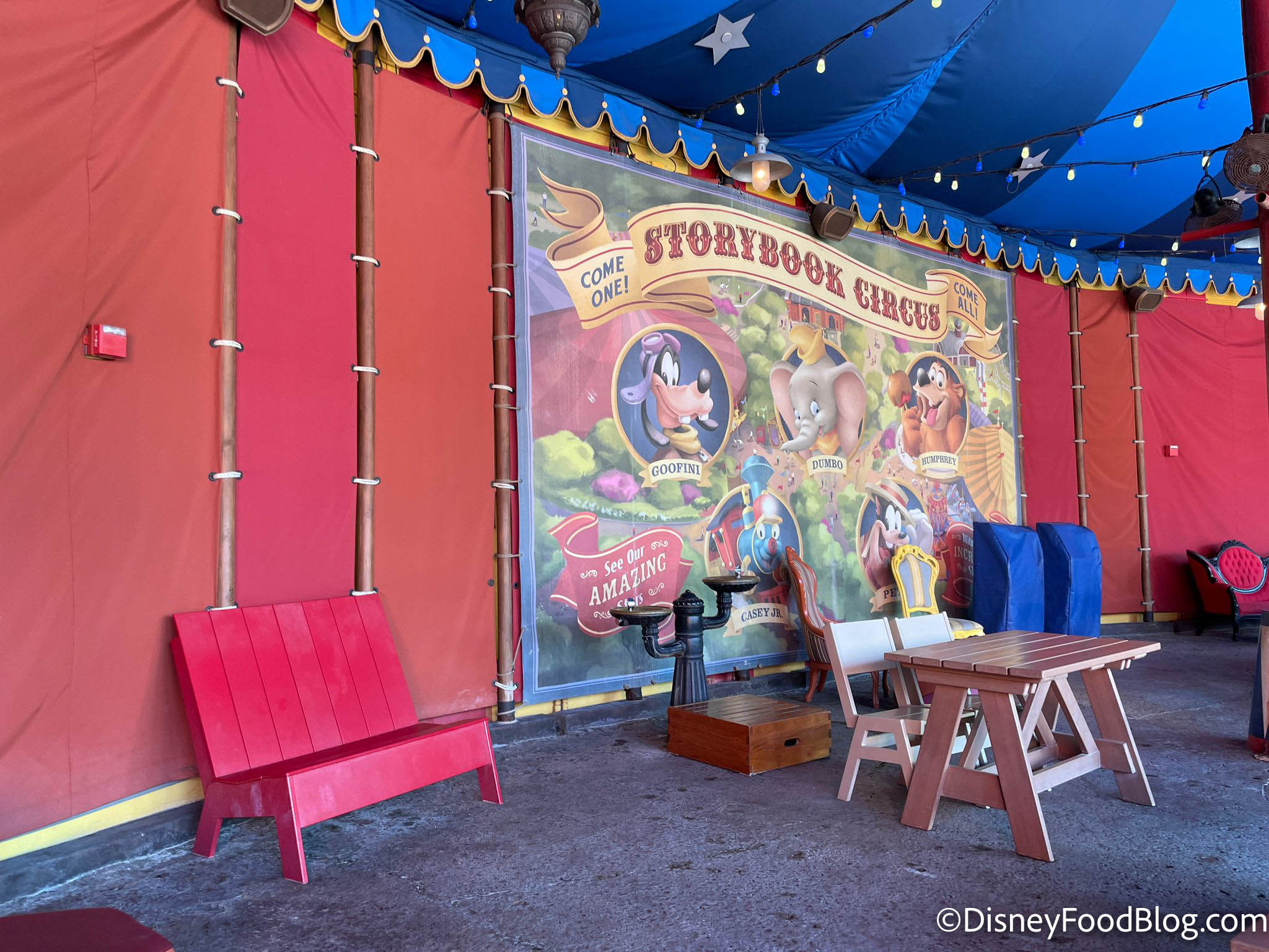 And the yellow tent in Storybook Circus has reopened after being repainted. This spot is located next to Pete’s Silly Side Show, and it can actually be a great spot to take a break and charge your phone.