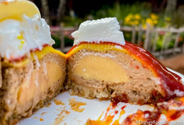 The chocolate-peanut butter mousse was the star of this cake! It was smooth and full of flavor. There was a little bit of crunch in the peanut cake, which we thought was a perfect pop of texture for the otherwise soft dessert. We didn’t love the gelatin coating over the treat (all the red and yellow stuff on top), but there wasn’t a ton of it.