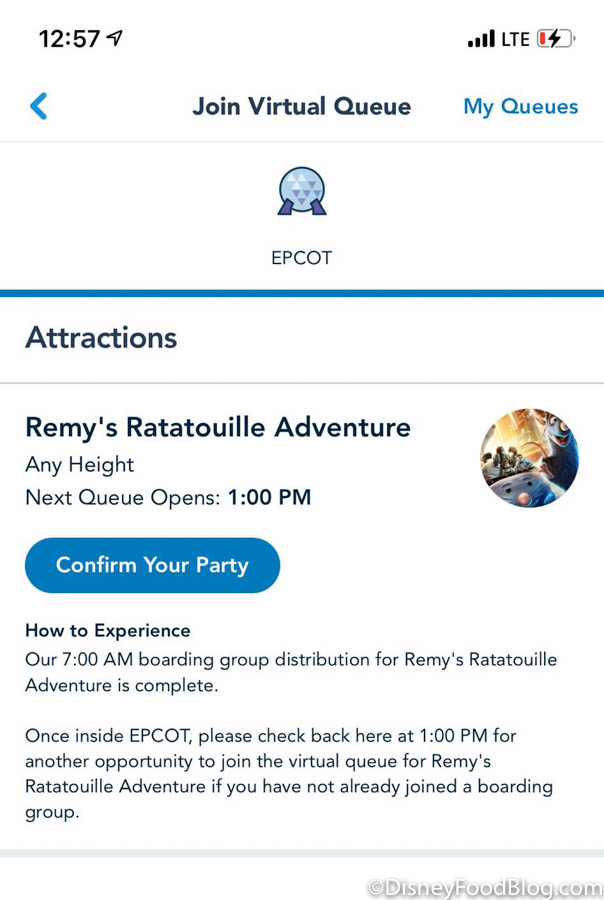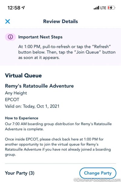 Here’s a look at the details for getting a boarding group for Remy’s Ratatouille Adventure: