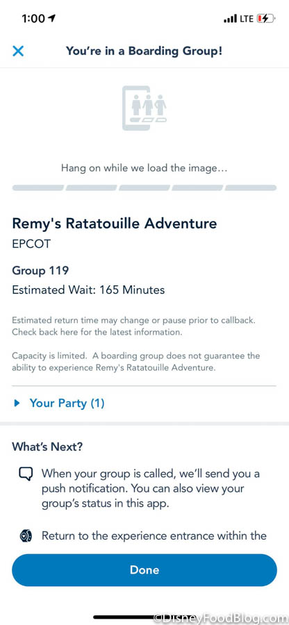 Then, 1PM hit, and thanks to our quick fingers, we got a boarding pass! We were placed in group 119 and given an estimated wait time of 165 minutes — meaning that’s how long it’s supposed to be before our group is called to get on the ride.