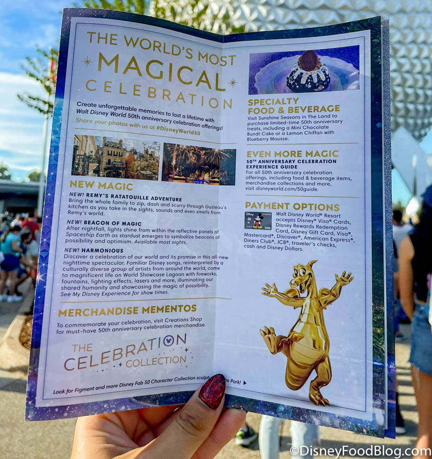 This commemorative guidemap features a beautiful royal blue cover with the 50th logo in shiny gold on the front. Inside, you’ll find all the usual tips and information about Magic Kingdom, plus a two-page fold all about the World’s Most Magical Celebration.