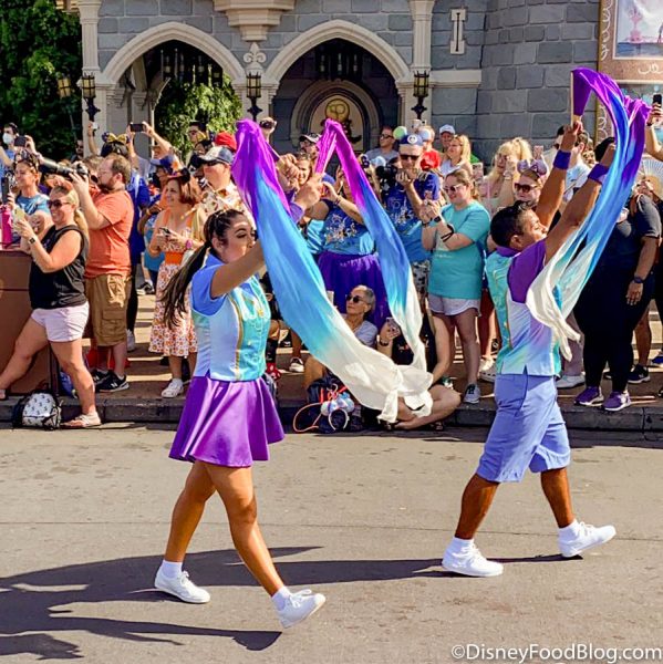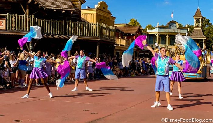 Mickey’s Celebration Cavalcade begins in Frontierland, then continues through Liberty Square, goes around the Hub in front of Cinderella Castle, and down Main Street, U.S.A. First up, we saw the performers coming down the street in Frontierland!