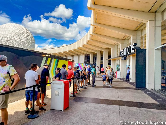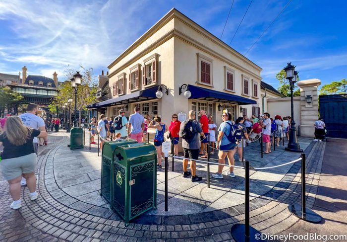There were also people in line to get on the new ride, Remy’s Ratatouille Adventure. You have to have a boarding pass to ride Remy’s and all of the boarding passes from the 7AM drop were booked up VERY quickly! Another round of passes will be released at 1PM today for people already inside EPCOT.