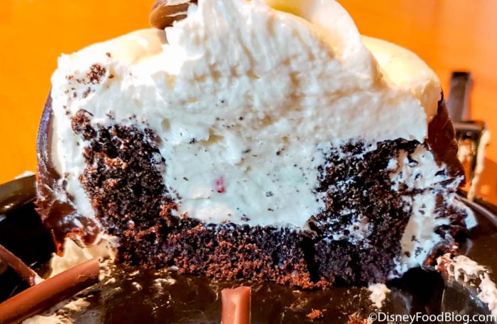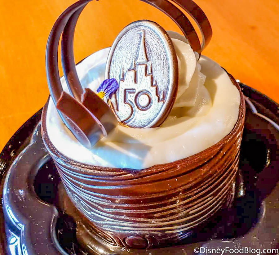 This petit stump cake is made with Chocolate Cake, Birthday Cake Buttercream Filling, and is surrounded by Chocolate “Bark” Fondant. It’s also topped with a 50th Anniversary Chocolate Coin! The cake matches the resort’s theme very well, so let’s dig in and see how it tastes!