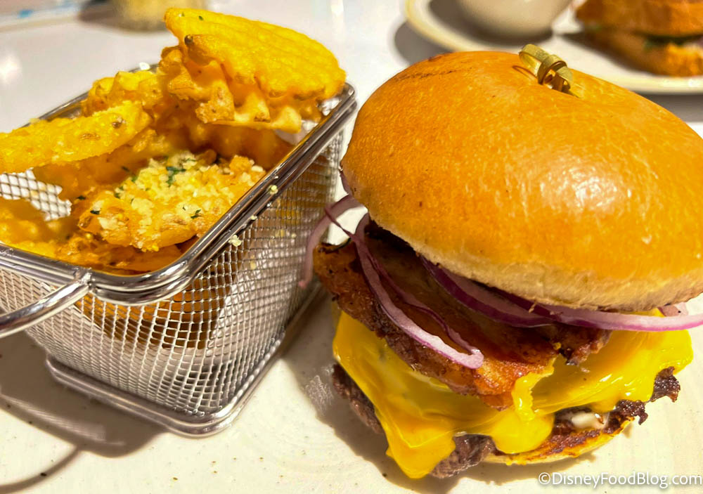We couldn’t NOT order the Steakhouse 71 Feast, which was indeed a feast. It came with Eggs Benedict, Scrambled Eggs, Bacon, Sausage, a Mickey-shaped Waffle, Bacon-Cheddar Grits, Breakfast Potatoes, and Fresh Fruit for $20.