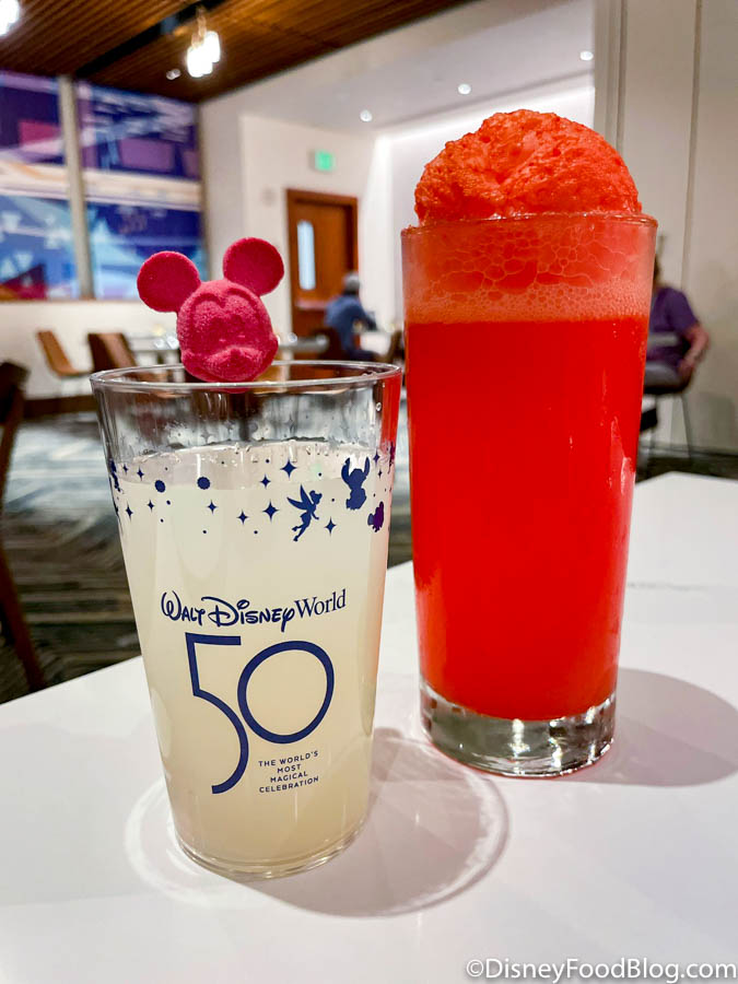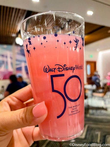 The EARidescent Sip-a-bration is made with Lemonade and Fruity Strawberry Punch, served in a souvenir 50th Celebration Cup. The little Mickey drops in the drink to change the color!
