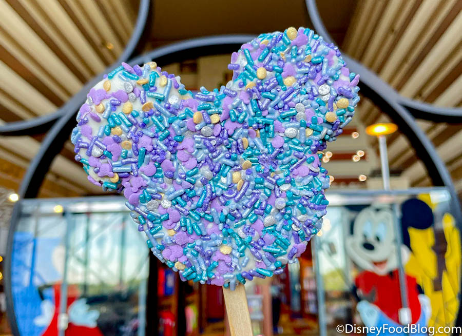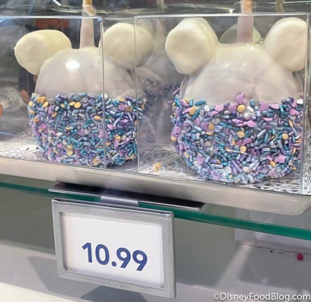 If you want to grab something with EARidescent sprinkles from the bakery case that isn’t a crispy treat, we saw that there were some candy apples also covered in white chocolate and more of those colorful decorations.