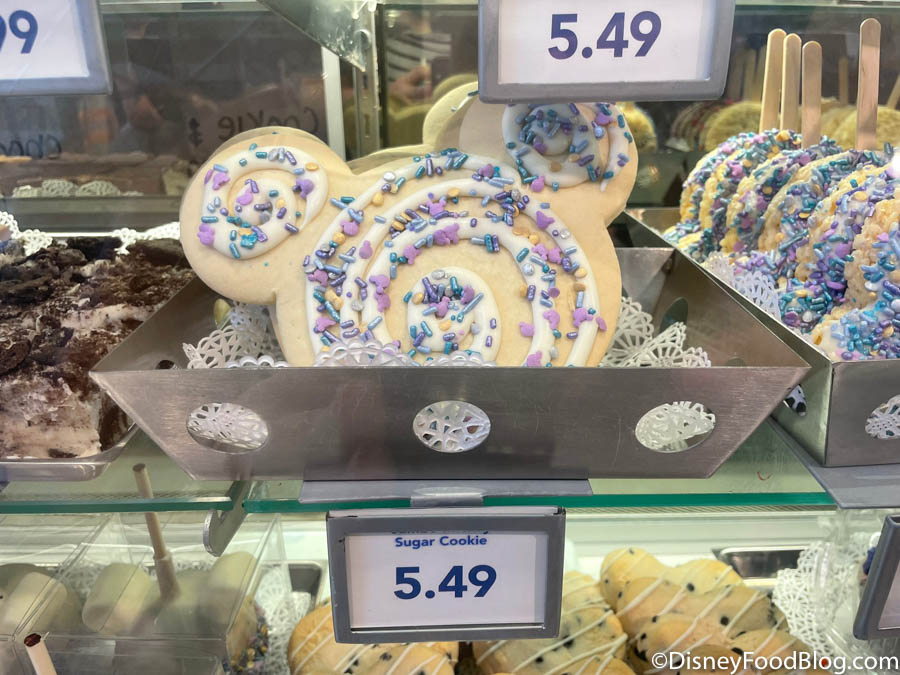At the bakery case inside of Bay View Gifts at Disney’s Contemporary Resort, we noticed that some classic Disney treats have gotten a bit of an EARidescent makeover! The Mickey Crispy Treat there was looking particularly special with ALL of those EARidescent sprinkles on it.
